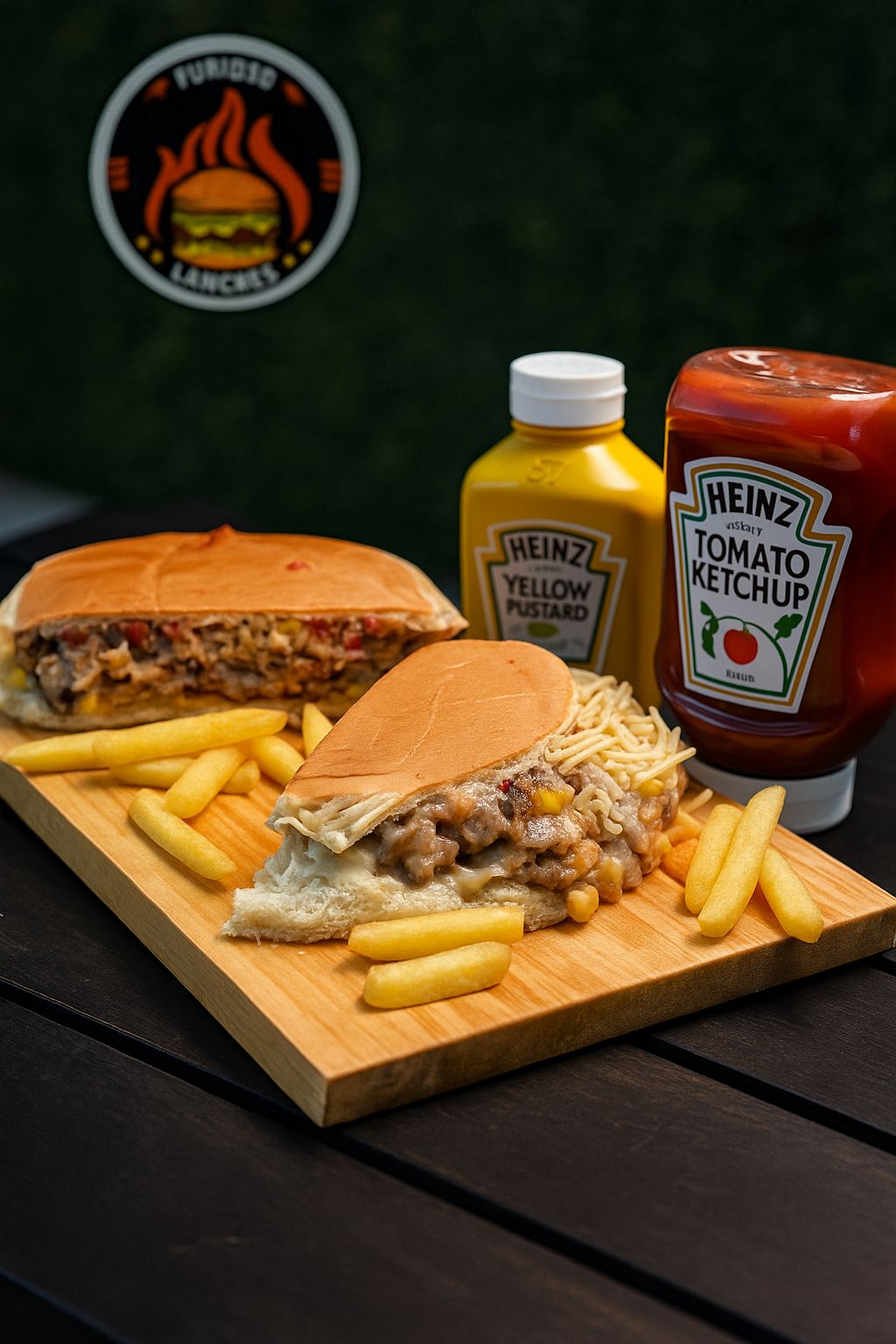 Pão de hambúrguer, ketchup, maionese, mostarda, 400g de calabresa, queijo muçarela, catupiry e tomate.